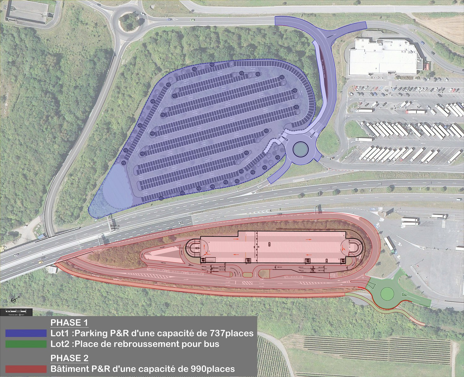 - A1 - P+R Mesenich frontière à Wasserbillig : Début des travaux en 2025 pour la phase 1, de l'autre-côté de l'autoroute avec 700 places prévues. Pour la phase 2, c'est une extension du P+R existant qui sera mis en place, pour mettre un parking sur plusieurs niveaux et ainsi obtenir 1000 places au lieu des 260 actuelles. Plan de situation.